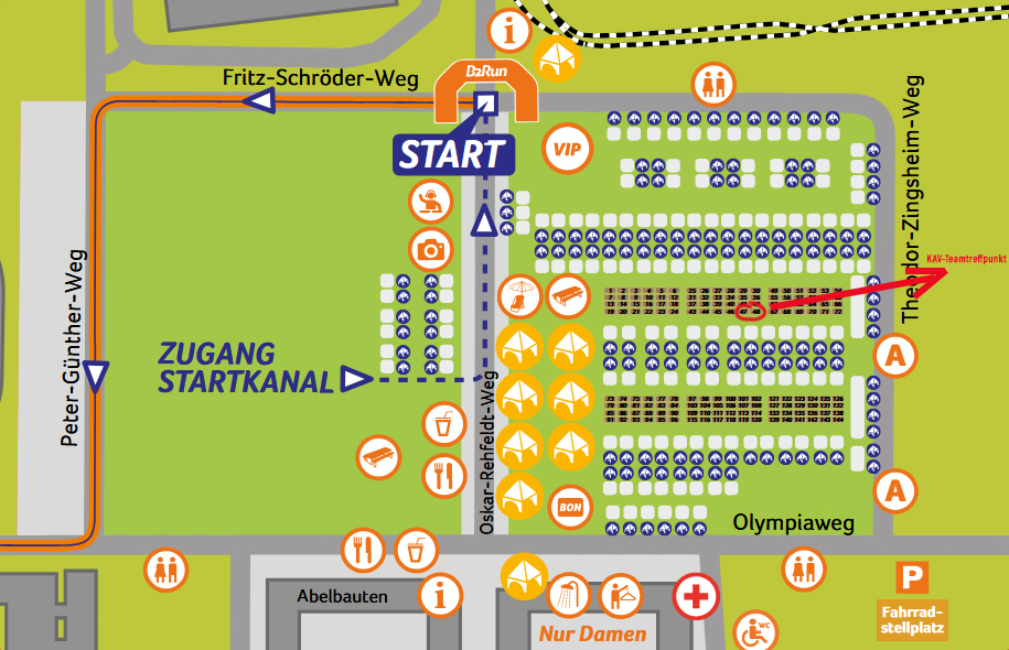 Ein KAV-Teamtreffpunkt direkt auf dem Eventareal bildet das Epizentrum rund um den Lauf: Hier treffen wir uns vor dem Start und auch nach dem Lauf und können unsere persönlichen sportlichen Errungenschaften ausgiebig miteinander feiern.